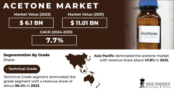 According to the SNS Insider report, the Acetone Market size was valued at USD 6.1 billion in 2023. It is estimated to hit USD 11.01 billion by 2031 and grow at a CAGR of 7.7% over the forecast period of 2024-2031. The acetone market is experiencing notable growth due to its wide range of applications in various industries, including chemicals, pharmaceuticals, cosmetics, and plastics. As a key solvent, acetone is integral in the production of numerous chemical products, such as methyl methacrylate (MMA) and bisphenol-A (BPA), which are essential for manufacturing plastics, resins, and synthetic fibers. The booming demand for lightweight and durable materials in the automotive and construction sectors is driving the consumption of acetone, as these industries increasingly rely on high-performance plastics to enhance fuel efficiency and structural integrity.