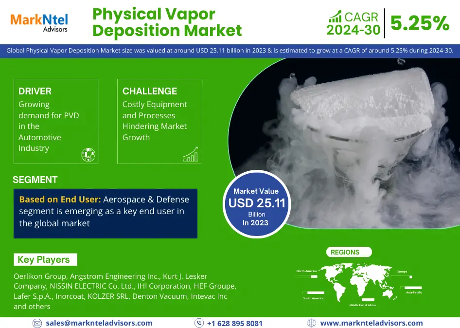The Global Physical Vapor Deposition Market size was valued at around USD 25.11 billion in 2023 & is estimated to grow at a CAGR of around 5.25% during the forecast period, i.e., 2024-30.