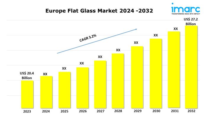 The Europe flat glass market size reached USD 20.4 Billion in 2023. Looking forward, IMARC Group expects the market to reach USD 27.2 Billion by 2032, exhibiting a growth rate (CAGR) of 3.2% during 2024-2032.